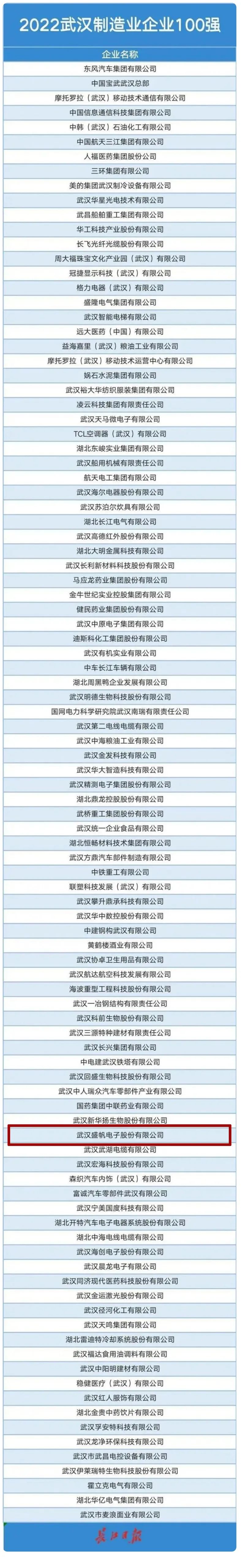 11月10日,由武汉企业联合会、武汉企业家协会、武汉发展战略研究院合作撰写的《2022武汉企业100强、制造业企业100强、服务业企业100强分析报告》发布。武汉HJC黄金城电子股份有限公司继刚刚入选“2022年度国家知识产权示范企业”之后,再次入选2022武汉制造业企业100强名单。